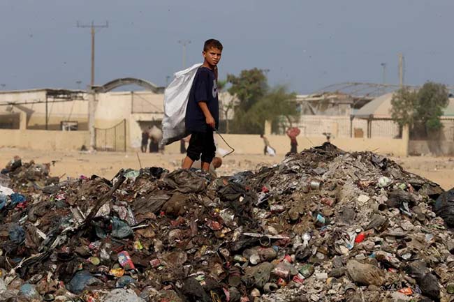 2025年11月3日,加沙地带南部汗尤尼斯,一名巴勒斯坦儿童正在垃圾填埋场附近的垃圾堆中翻找 (路透)
