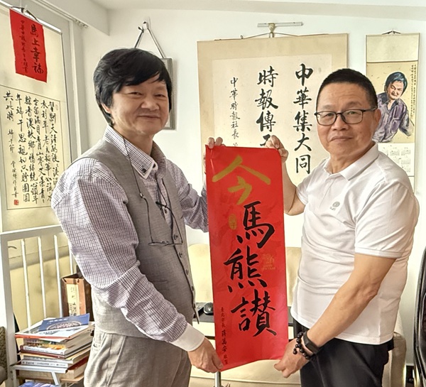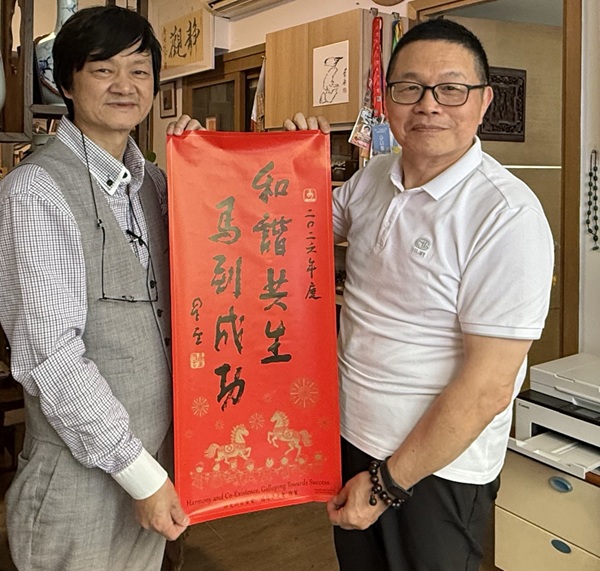 据悉,年近七旬的刘冠逸记者精神矍铄,此次专程从台湾赴港,不仅带来了其深耕新闻领域多年的行业观察,更肩负特殊使命——受台北市长蒋万安特别嘱托,携来新春贺礼。礼品包括蒋万安市长亲嘱的春联“今马熊赞”,以及刘冠逸与台湾立法议员徐弘庭合撰的春联“马踏飞燕迎新春 千里之行运腾飞”,同时还带来了星云大师手书“和谐共生,马到成功”的墨宝,赠与曾晓辉教授。这些墨宝与春联兼具禅意与岁华之韵,承载着两岸同胞对新春的祝福与对和谐发展的期盼。